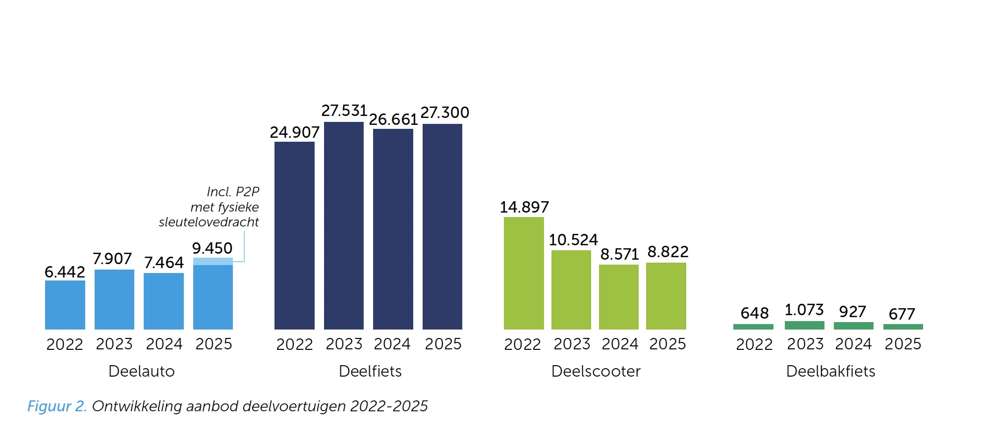Het totale aanbod groeide in 2025 met 6% naar ruim 46.000 deelvoertuigen. Op papier klinkt dat als een gezonde groeimarkt. In werkelijkheid laat de uitsplitsing een ander beeld zien. De groei komt vrijwel volledig van deelauto’s en deelscooters, terwijl deelbakfietsen juist met bijna een derde afnemen. De spectaculaire groeifase van de afgelopen jaren lijkt voorbij; de markt differentieert en consolideert.