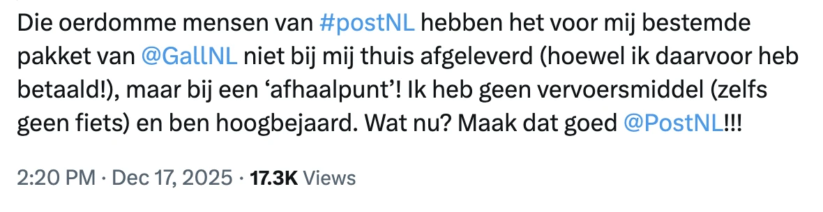 Inmiddels biedt half Amsterdam aan om het voor Fon te regelen (en geeft andere goedbedoelde adviezen). Dat is lief. Maar, PostNL en Gall, waar is de menselijke maat? Waarom lossen jullie dit niet gewoon netjes op voor Fon? Waar is de warmte van kerst in jullie bezorgharten gebleven? A Christmas Carol 2025. Kom op. Spring op de vrachtfiets, haal die doos op en breng ’m (de volgende keer) met excuses bij haar thuis; het is niet goed gegaan, maar we lossen het voor je op. Het minste wat jullie hadden kunnen doen, was even contact met haar opnemen. Dat is menselijke maat; ook in drukke tijden.