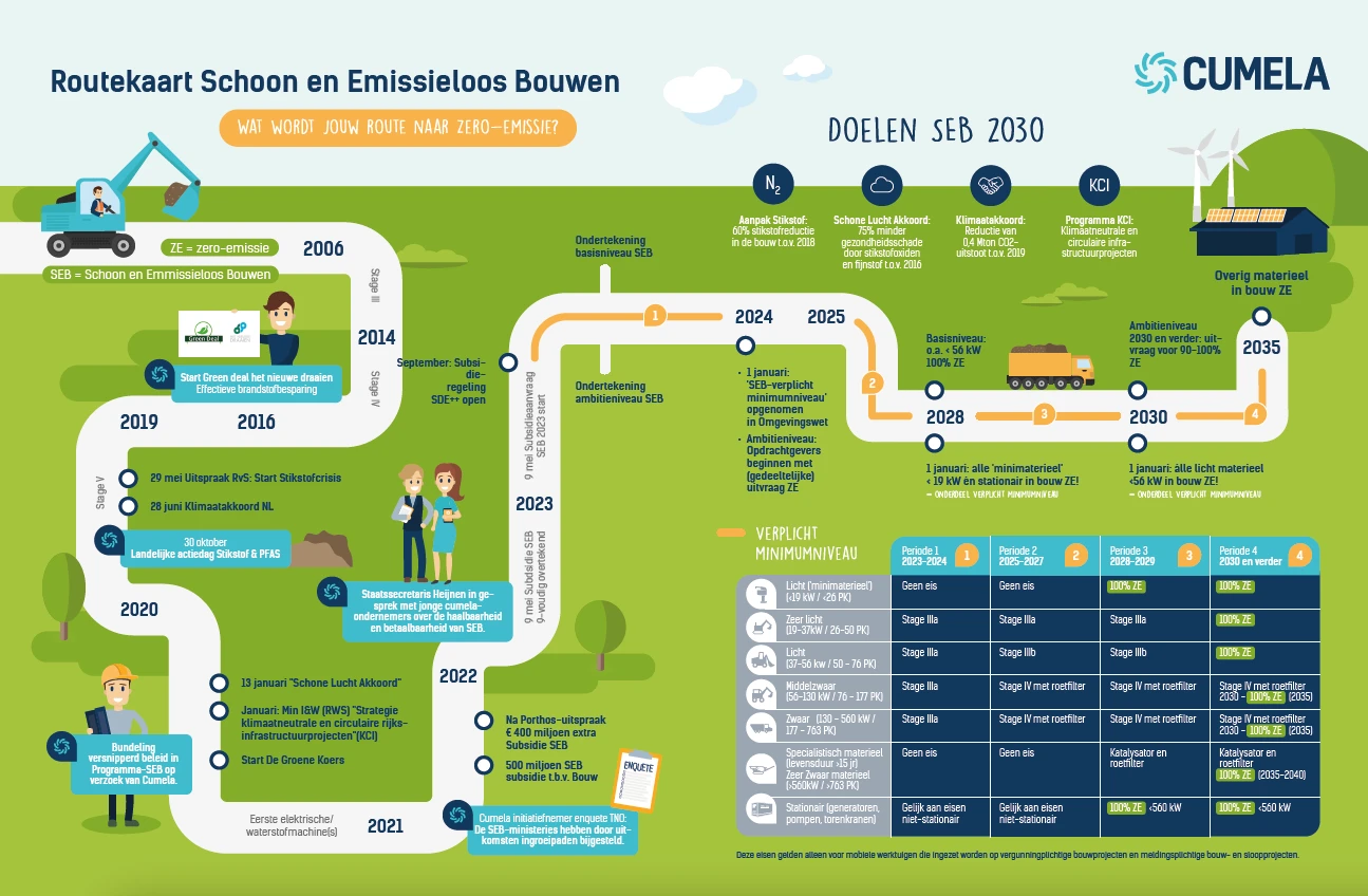 TNO heeft berekend dat de huidige koers van het Convenant SEB naar verwachting voldoende CO2-reductie en gezondheidswinst oplevert, maar dat de stikstofdoelen nog niet binnen bereik zijn. Een belangrijk knelpunt daarbij is de beperkte toepassing van het afgesproken minimumniveau voor verduurzaming van mobiele machines, met name in private projecten. De meerkosten voor de huidige uitvoering richting 2030 worden geraamd op 2,6 miljard euro, oplopend tot 4,9 miljard euro bij maximale naleving. De overheid ondersteunt hierin met financiële instrumenten, maar de opgave blijft fors.