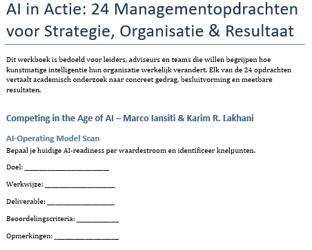 In totaal bevat AI in Actie vervolgens 24 opdrachten, vier per boek, die elk een helder doel, concrete werkwijze, tastbaar resultaat en beoordelingscriteria hebben. Wie het programma doorloopt, beschikt na twaalf weken over een scherp beeld van de eigen AI-volwassenheid, complete verbeterplannen per team of proces, en een intern portfolio dat laat zien waar waarde verloren of juist gecreëerd wordt.