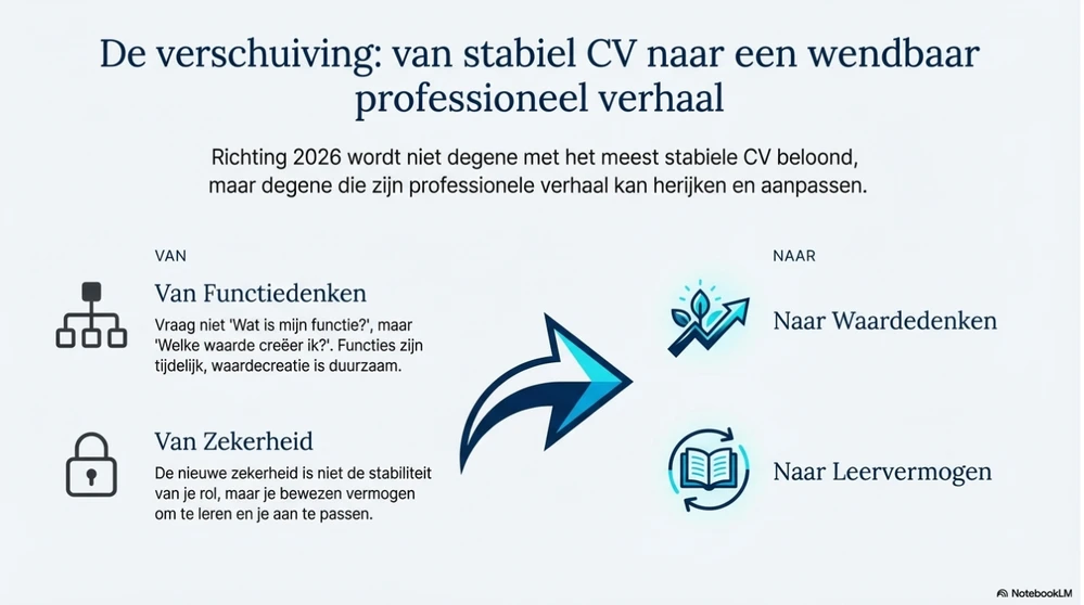Richting 2026 wordt niet degene beloond met het meest stabiele CV, maar degene die zijn professionele verhaal kan herijken. Van functiedenken naar waardedenken. Van zekerheid naar leervermogen.