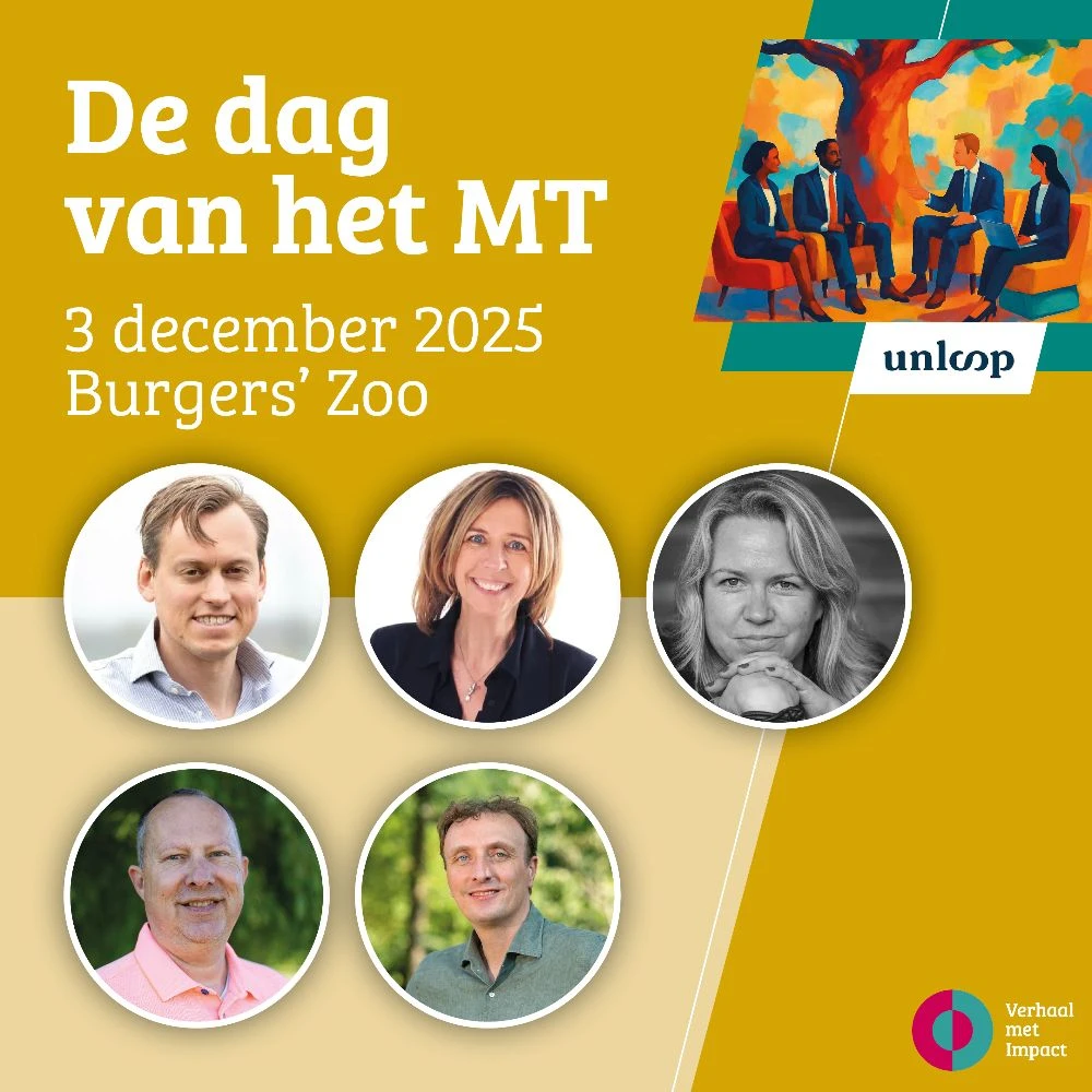 Op woensdag 3 december organiseren Unloop en Verhaal met Impact samen De Dag van het MT. Dit seminar richt zich op het versterken van managementteams, met aandacht voor de unieke dynamiek binnen en rond het MT. Tijdens deze dag werken we met de drie thema’s Richting, Relaties en Ritmes – de kern van mijn boek – en ontvangen we inspirerende bijdragen van Anje-Marijcke van Boxtel (leiderschapscoach en coach van het Team Volvo Ocean Race), Shirine Moerkerken (organisatiekundige en conflictexpert), Rini van Solingen (CTO bij Prowareness en deeltijdhoogleraar aan de TU Delft) en Alex van Hooff (directeur Burgers’ Zoo).